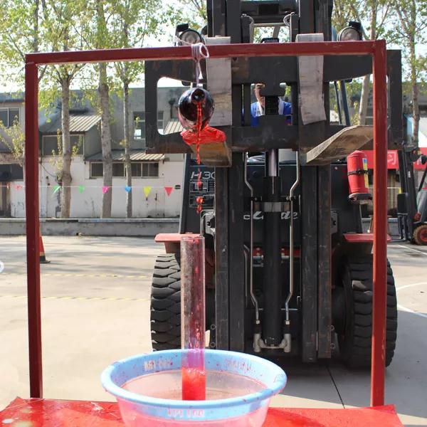 叉車(chē)倒紅酒,叉車(chē)貨叉尖端裝置一根前端稍彎曲鐵針,用鐵針頂住紅酒瓶底部,參賽選手需要駕駛叉車(chē)將紅酒平穩(wěn)倒入杯中。主要比拼選手掌握叉車(chē)的平穩(wěn)性和精細(xì)度。